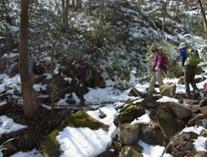 日陰になるところでは、まだ雪が残っていて要注意。 |
