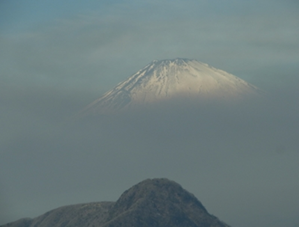 尾根に出て、目に飛び込んできたのは朧の雲の上に浮かぶ富士山。 |
