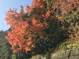 バスで地蔵堂に到着、駐車場の紅葉が鮮やか!しっかりと体操してスタート。 |