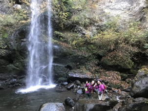 夕日の滝は見事、元気そうな女の子がにこやかに合図してくれました。 |